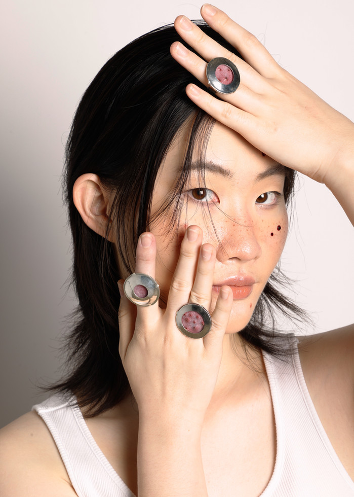 这一系列作品从痤疮中汲取灵感,将肌肤凸起的纹理转化为珠宝。抛光银饰呼应光滑的肌肤和月光,红色珐琅圆点则令人联想起生长痕迹中的瑕疵。项链和戒指的韵律序列既反映了痘痘的周期性,也反映了月亮的盈亏。